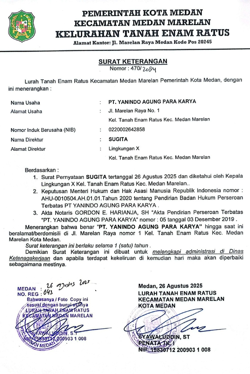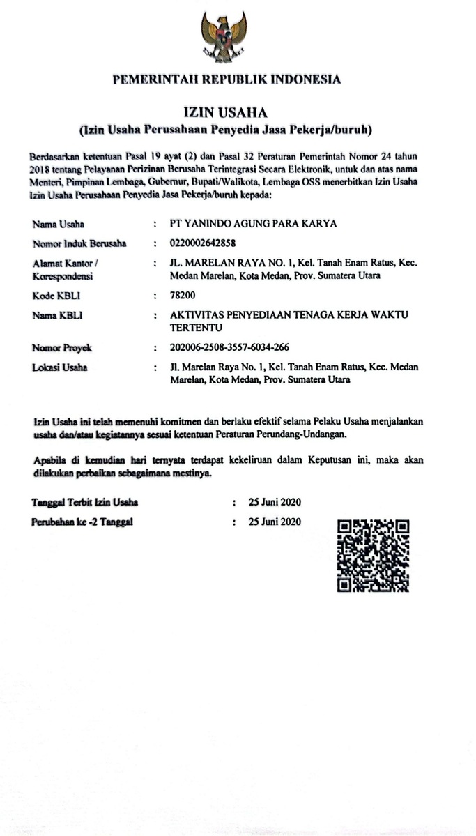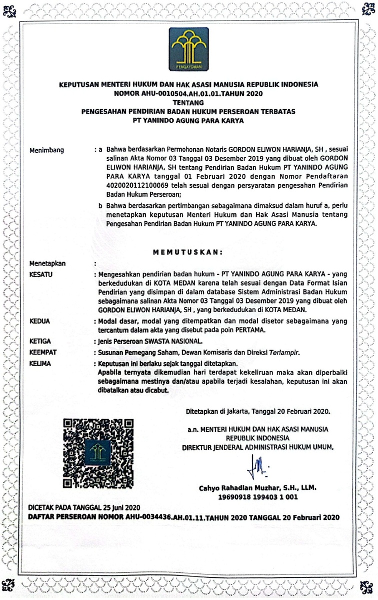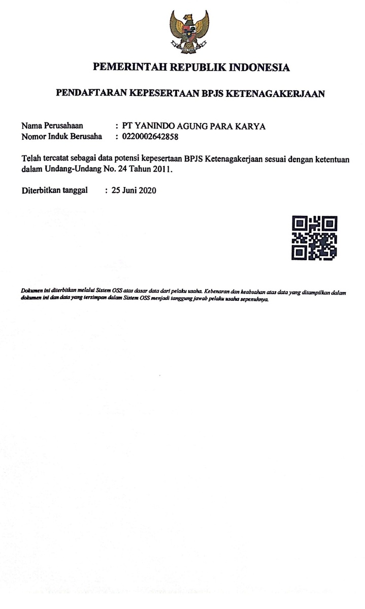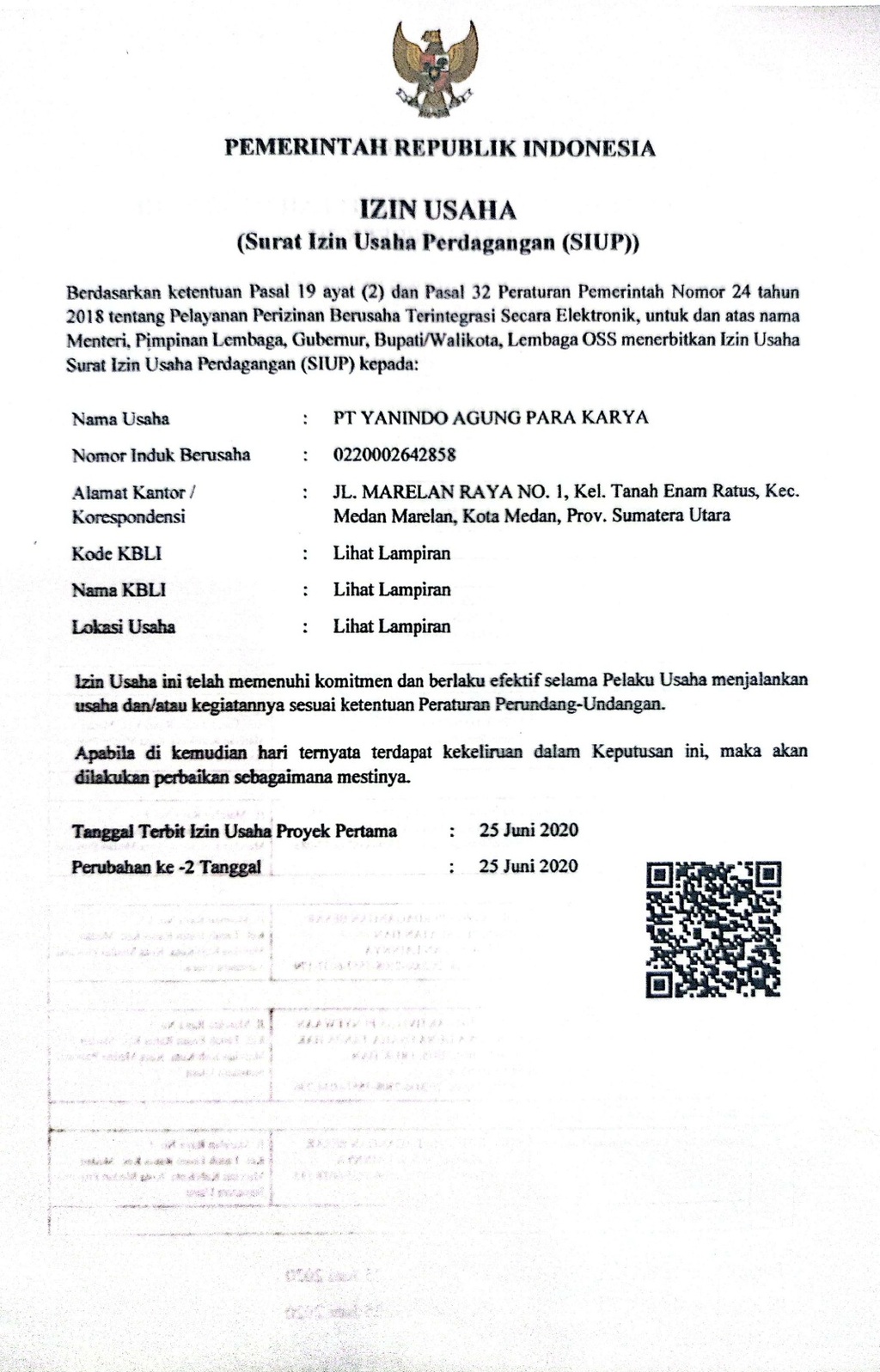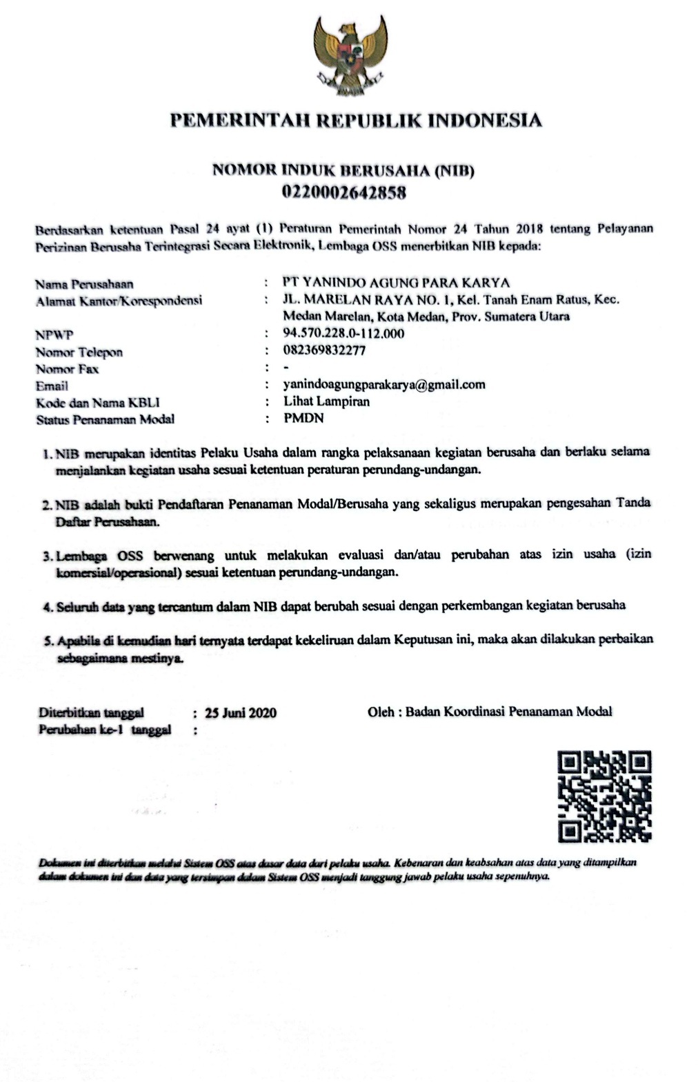 Kami PT. YANINDO AGUNG PARA KARYA merupakan sebuah perusahaan yang berdiri pada tanggal 3 Desember 2019 dihadapan Notaris Gordon Eliwon Harianja, S. H. dengan bentuk Perseroan Terbatas.